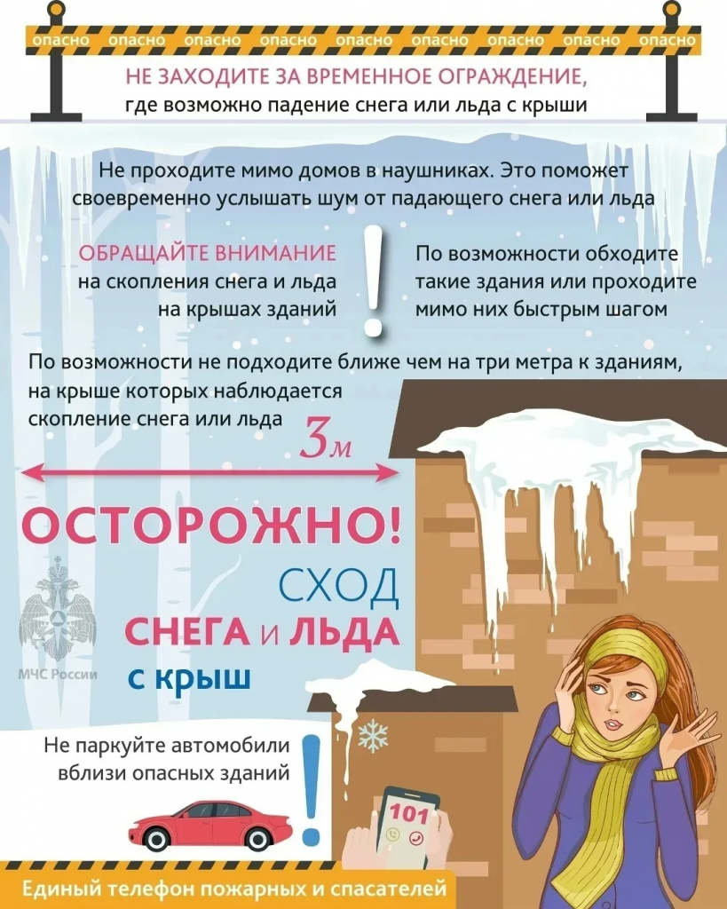 ✔Обращайте внимание на скопление снежных масс, наледи и сосулек на крышах и, по возможности, не подходить близко к стенам зданий.